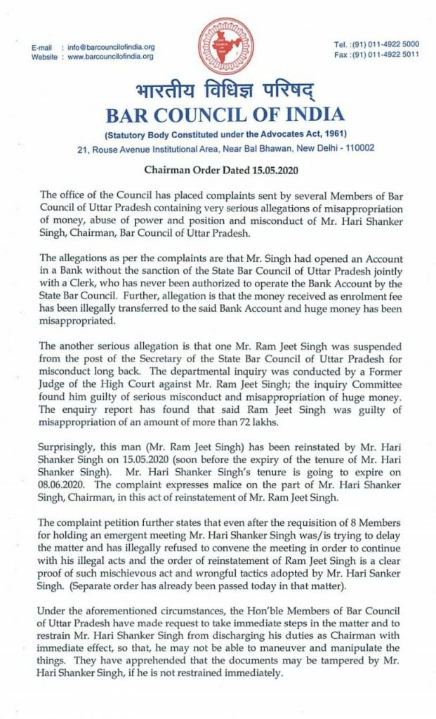 Bci Restrains Chairman Of Up Bar Council From Discharging Official Duties On Allegations Of Misconduct Seeks His Reply Read Order Sign up to the bar council's fortnightly newsletter.